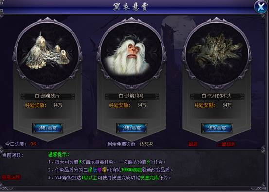 冥衣悬赏:有白绿蓝紫橙,等级越高奖励越丰富。一键橙色,就会为大家自动刷新到橙色任务后停止,橙色任务还可以额外获得悬赏礼包。免费5次刷新没了之后只需要花费30000银两就可以继续刷新了,对于换取经验可是大大的划算哦!VIP1以上还可以快速完成,都不用跑啦!