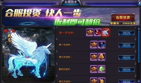投入2000元宝即可开启合服惊喜大投资,7天每天有收益,还能领取超炫灵魂天马坐骑皮肤。
