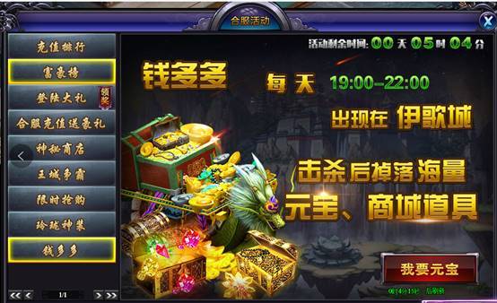 活动时间:合服后前五天,每天19:00-20:00,指定地点击杀BOSS,即可掉率极品道具哦!