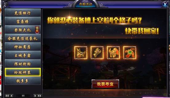 合服活动期间,寻宝有较高几率能够寻出玲珑神装,还不快快行动起来