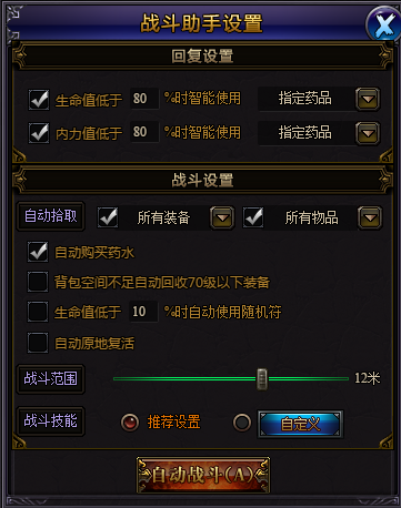在挂机设置中,您可以对自动吃药、自动拾取、挂机范围等进行设定。